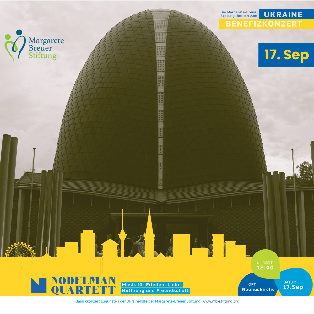 Ein Krieg in Europa – das hätten die meisten von uns bis vor Kurzem nicht für möglich gehalten. Für die Menschen in der Ukraine ist es eine Katastrophe. Ihre Heimatstädte werden zerstört, Familien werden auseinandergerissen, Kinder werden aus ihrem friedlichen Alltag herausgerissen und müssen fliehen, um ihr Leben zu retten. Und die in der Ukraine bleiben, geraten in die Epizentren schrecklicher Raketenangriffe und Bombenanschläge, werden durch solchen Raketenbeschuss verletzt und bleiben oft für lange Zeit unter Trümmern eingeschlossen. Die traurige Statistik des Krieges berichtet am Anfang August über 1.000 verletzte Kinder, von denen das russische Militär bereits 358 ukrainische Kinder getötet und 700 verletzt hat. Die Verletzungen führen oft zu den Amputationen. Leider steigen diese Zahlen ständig. Mit dem Benefizkonzert möchte die Margarete-Breuer Stiftung ein Zeichen setzten – für FRIEDEN, FREUNDSCHAFT, HOFFNUNG und LIEBE. Am 17. September 2022 um 18:00 Uhr erwartet Sie ein kammermusikalisches Highlight. Das bekannte Nodelman-Quartett wird in der einzigartigen Umgebung des Kuppelsaals der St. Rochuskirche in Düsseldorf eine abwechslungsreiches Programm – von klassischem virtuosem Violinen-Solo bis hin zu Stücken aus der ukrainischen Volksmusik. – darbieten. Ergänzt wird das musikalische Angebot noch durch eine Fotoausstellung sowie durch eine Live-Animation, die die musikalischen Darbietungen visuell begleitet. Der Eintritt ist kostenlos, wir bitten jedoch um Spenden zur Unterstützung der Stiftung MBS.UA.